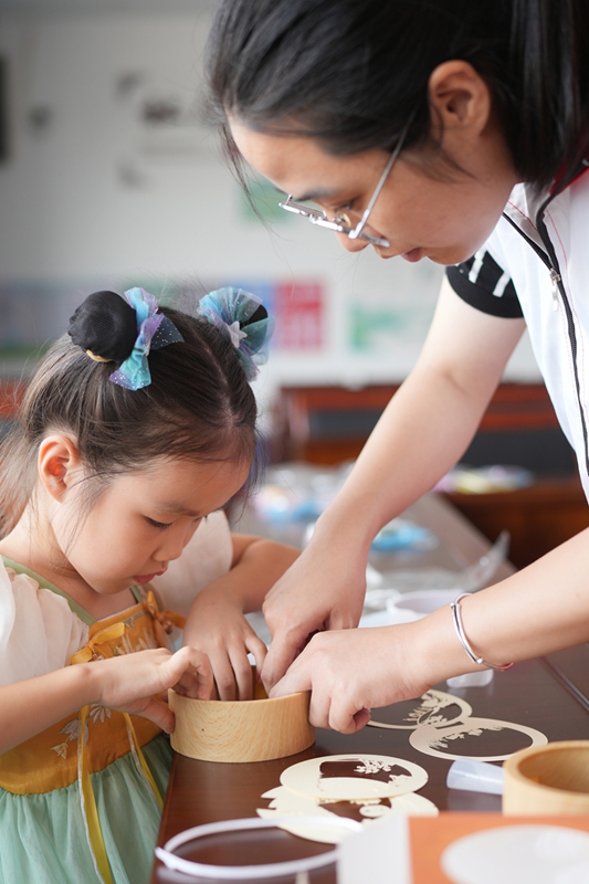 9月13日,在南京市安德门幼儿园,小朋友在老师的指导下学习做月饼。